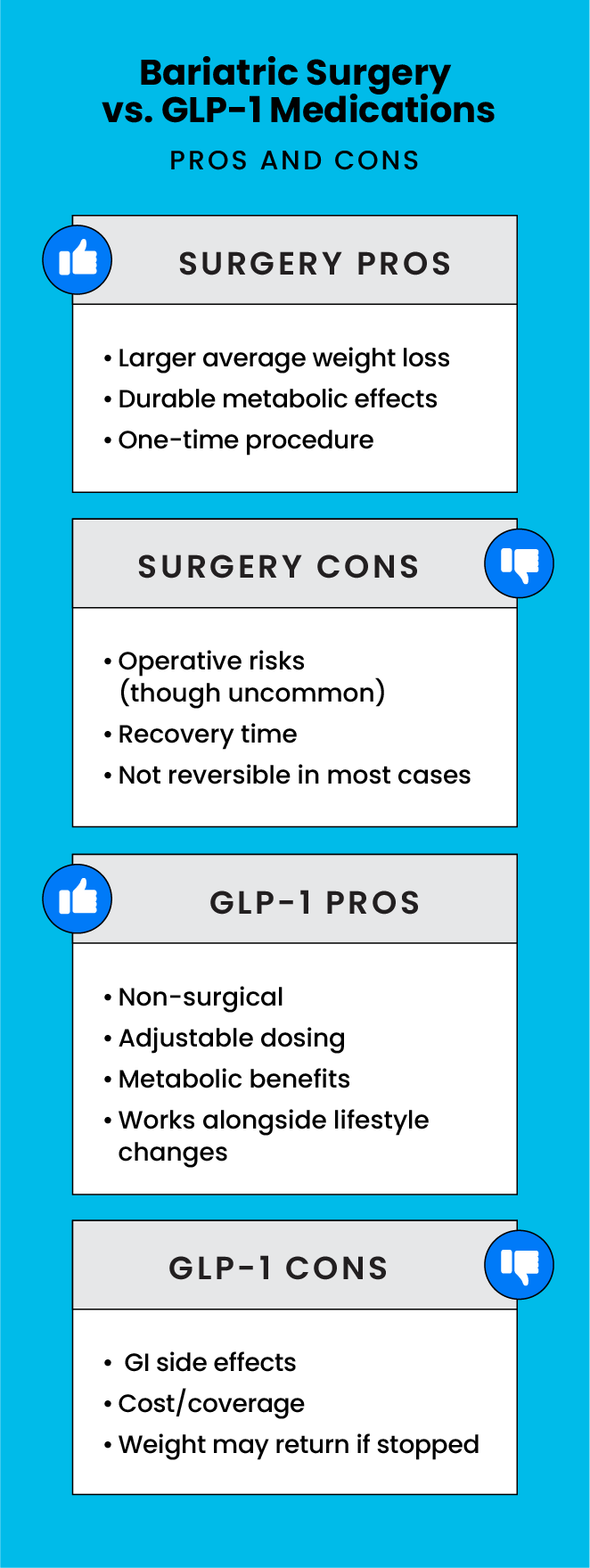 GLP 1 medications may be a good fit for adults who prefer a non-surgical path, can take medication as prescribed with regular monitoring and meet clinical/insurance criteria.