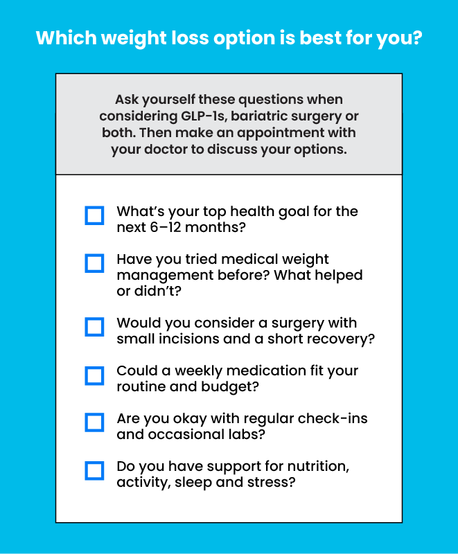 If you’ve made meaningful changes to diet, exercise and lifestyle but still aren’t seeing the weight loss results you need, you may be wondering what the next step should be. Bariatric surgery and GLP-1 medications are two evidence-based options your care team may discuss with you if you have a higher body mass index or BMI, or if you have weight-related health conditions such as type 2 diabetes.